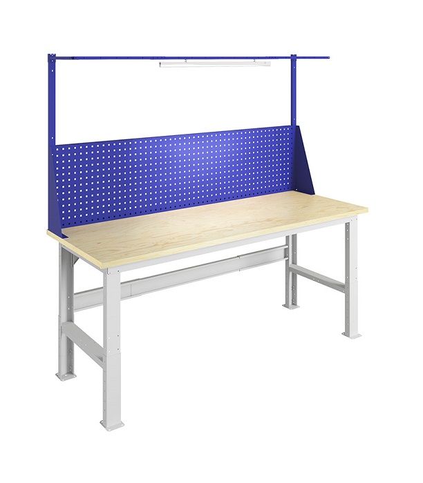 Стол производственный №222 предназначен для организации рабочего места в мастерских, автосервисах, на промышленных предприятиях. Изготовлены из высококачественной стали и отличаются усиленной конструкцией. Стол выдерживает нагрузку 1500 кг. В комплект стола входит: Столешница W-200 мм 1 шт, Опора регулируемая WF-2  2 шт, Планка и косынки WSh 1 шт, Перфорированный экран с косынками 1 шт, Комплект освещения W 1 шт, Усилитель верстака 200. Столешница выполнена из фанеры толщиной 30 мм. Опоры возможно регулировать по высоте от 870 до 1120 мм с шагом 50 мм. Предусмотрена площадка для монтажа комплекта колес WS к опоре. Дополнительно на стол можно установить: подвесную тумбу WD-0; заменить накладку (оцинкованный металл толщиной 1,5 мм или окрашенный металл 3 мм); перфорированный экран; аксессуары для инструментов. Стол производственный поставляется в разобранном виде. Цвет: корпус - серый Ral 7038, столешница не окрашена, экран - синий Ral 5002