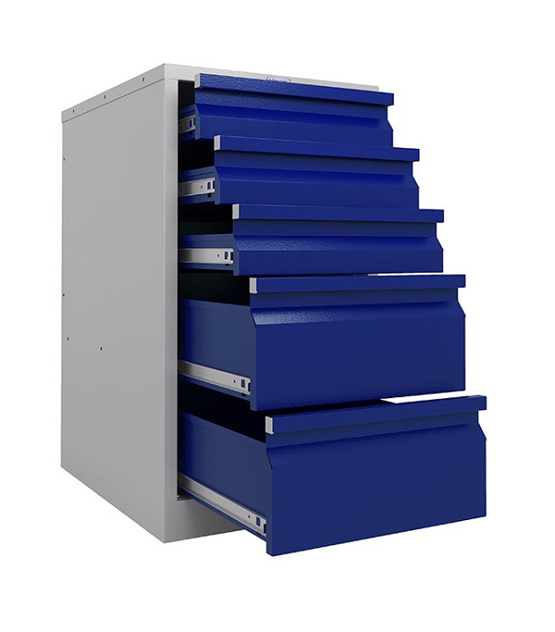 Тумба Profi WD-5 предназначена для хранения вещей, инструментов и оснастки в производственных помещениях, гаражах, мастерских. Изготовлена из высококачественного металла. Комплектуется пятью выдвижными ящиками с телескопическими направляющими. Полезные размеры ящиков (ВхШхГ): 3 ящика - 100х380х600 мм, 2 ящика - 190х380х600 мм. Грузоподъемность каждого ящика 30 кг. Ящики открываются на все длину, что позволяет использовать 100 % пространства. Тумба Profi WD-5 закрывается центральным ключевым замком Практик (1000 комбинаций). Цвет: корпус - серый Ral 7038, ящики - синий Ral 5002